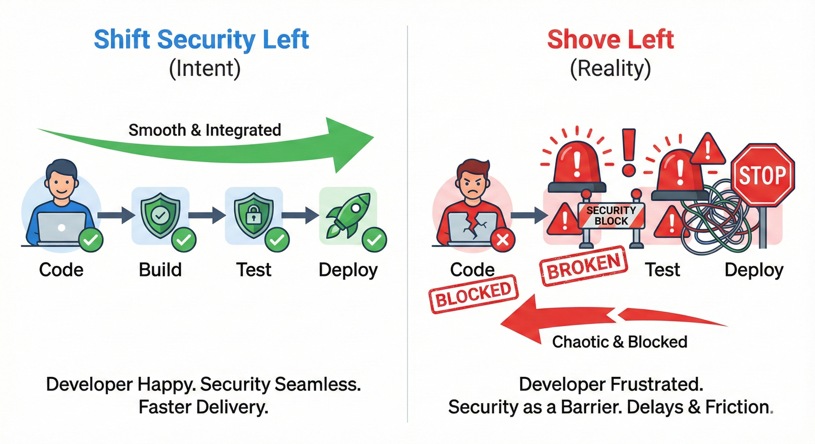 The "shove-left" problem: The industry's well-intentioned mantra to "shift security left" was meant to catch issues earlier. In practice, this often became "shoving left"—simply pushing noisy, high-friction scanning tools into the CI/CD pipeline or the developer's IDE.