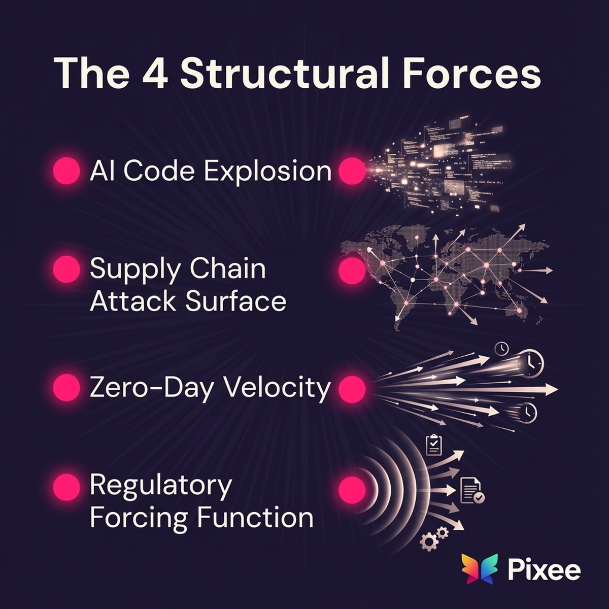 Four external forces—AI code generation, supply chain complexity, zero-day velocity, and regulatory expansion—are accelerating triage demands beyond human capacity.